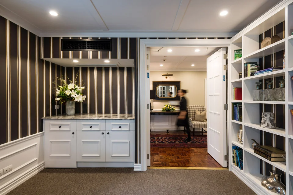 Neil worked with the clients to return as much period character as possible to the original house on the site of the George Hotel, used as its most exclusive accommodation. Timeless classicism is the overriding feel, achieved with new panelling and ceiling battens throughout, complimented by bold period style wallpapers.